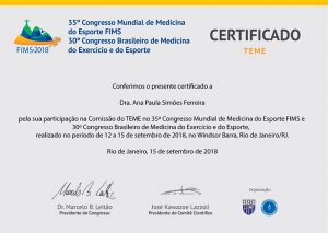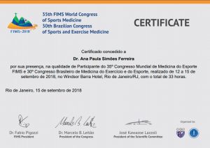 Confira o certificado da Dra. Ana Paula Simões no 35° Congresso Mundial de Medicina do Esporte FIMS.
