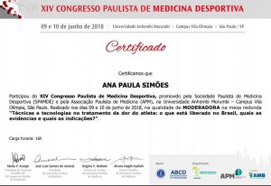 Confira o certificado de palestrante da Dra. Ana Paula Simões no XIV Congresso Paulista de Medicina do Desportiva.