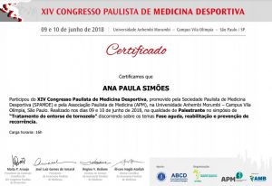 Confira o certificado de palestrante da Dra. Ana Paula Simões no curso O Entorse do Tornozelo - Da Prevenção à Reabilitação!