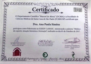 Confira o certificado de palestrante da Dra. Ana Paula Simões no XXXIV CoMASC.