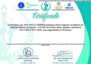 Confira o certificado de participação da Dra. Ana Paula Simões no Congresso Acadêmico de Ciências Médicas do Esporte - CACME.
