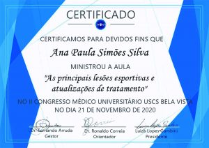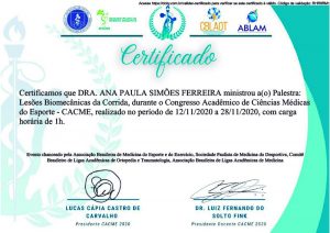 Confira o certificado de palestrante da Dra. Ana Paula Simões no Congresso Acadêmico de Ciências do Médicas Esporte.
