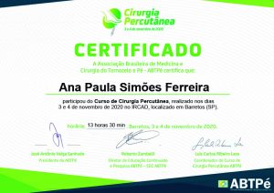 Confira o certificado da Dra. Ana Paula Simões no curso de Cirurgia Percutânea.