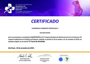 Confira o certificado de palestrante da Dra. Ana Paula Simões no Congresso Brasileiro de Medicina do Exercício e do Esporte.