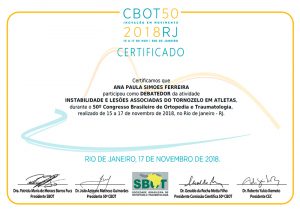 Confira o certificado de debatedor da Dra. Ana Paula Simões no Congresso Brasileiro de Ortopedia e Traumatologia.