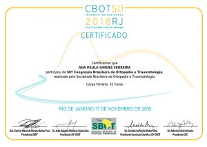 Confira o certificado da Dra. Ana Paula Simões no Congresso Brasileiro de Ortopedia e Traumatologia.