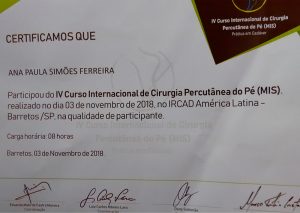 Confira o certificado da Dra. Ana Paula Simões no IV Curso Internacional de Cirurgia Percutânea do Pé (MIS).