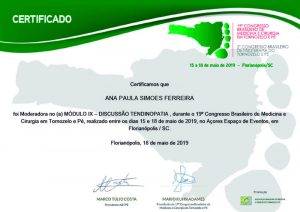 Confira o certificado de moderadora da Dra. Ana Paula Simões no 19° Congresso de Brasileiro de Medicina e Cirurgia em Tornozelo e Pé.